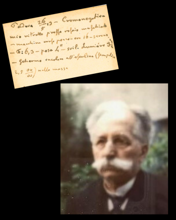 Ma risale solo a qualche settimana fa la scoperta di due piccole scatole contenenti alcune lastre di vetro, sulle quali sono impresse delle immagini in negativo e in positivo… a colori! Queste lastre ci permettono di avere uno sguardo a colori sul mondo di Bernardi e su Bernardi stesso, perché contengono anche l’unico ritratto di Bernardi a colori. Da appassionato di tecnica fotografica qual era, Bernardi correda poi ogni lastra con la descrizione del soggetto, dell’esposizione, delle condizioni atmosferiche e del materiale usato per realizzare la lastra.
